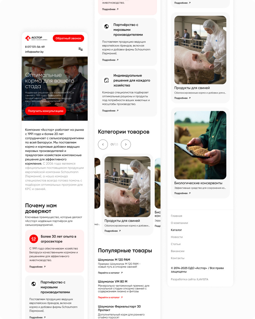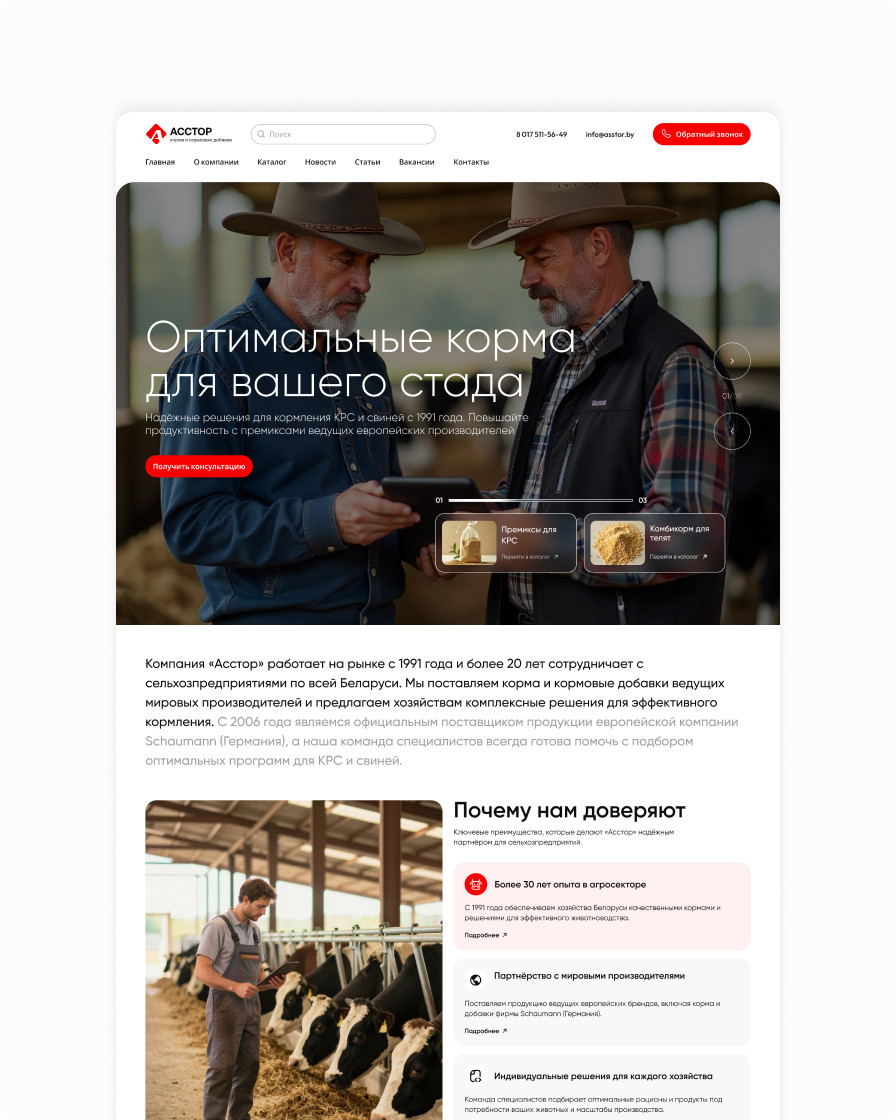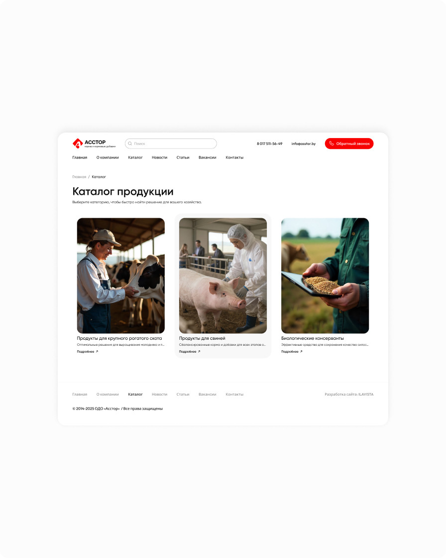 Корпоративный сайт компании «Асстор» с обновлённым интерфейсом и удобным каталогом кормов и кормовых добавок для крупного рогатого скота и свиней.
