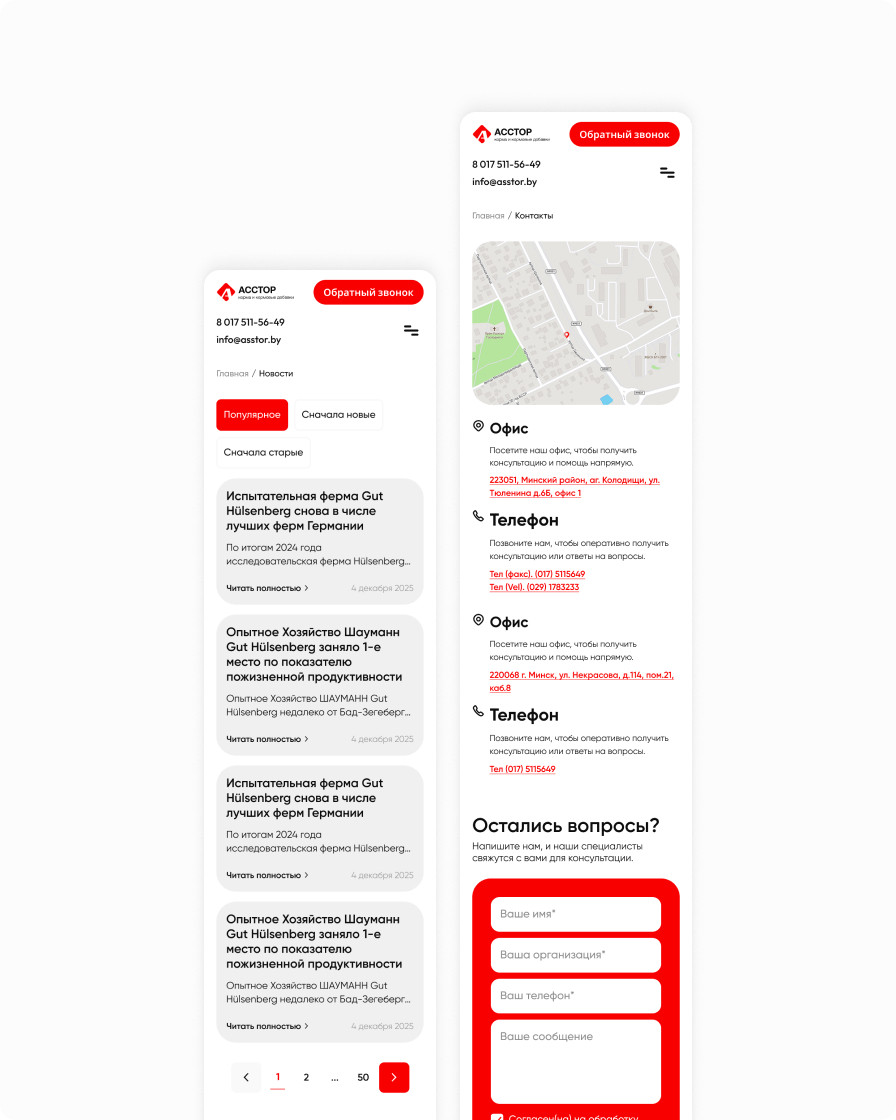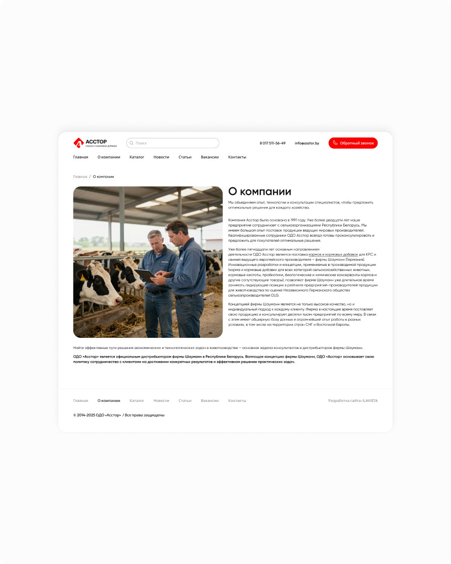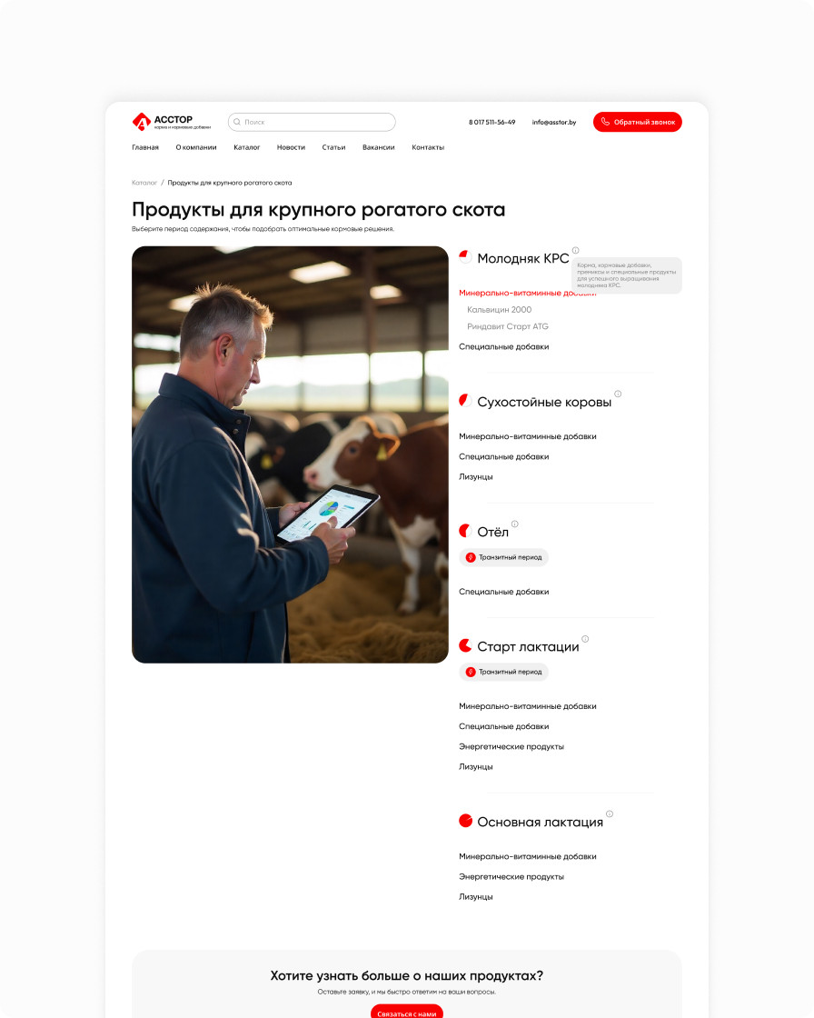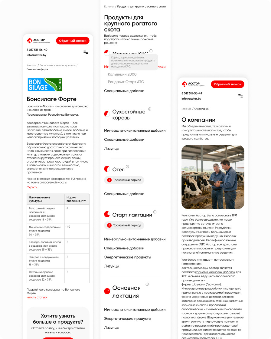 Корпоративный сайт компании «Асстор» с обновлённым интерфейсом и удобным каталогом кормов и кормовых добавок для крупного рогатого скота и свиней.